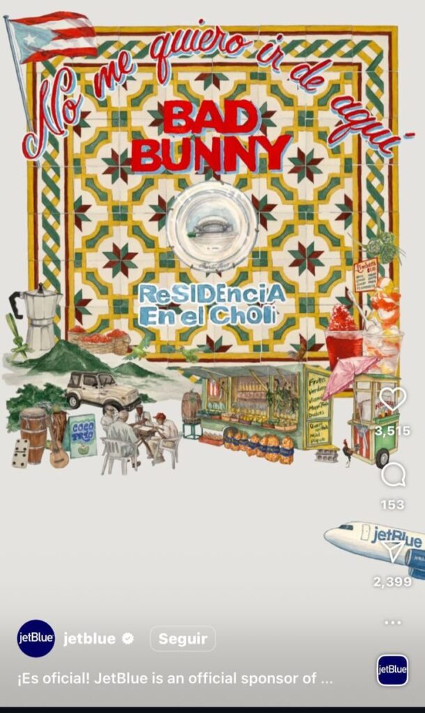 San Juan, Puerto Rico. – La aerolínea JetBlue lanzó el pasado jueves un sorteo especial con el que cinco personas tendrán la oportunidad de viajar a Puerto Rico y asistir gratuitamente a uno de los conciertos de la residencia del artista Bad Bunny, titulada “No Me Quiero Ir de Aquí”, que se celebra en el Coliseo José Miguel Agrelot, conocido popularmente como el Choliseo.